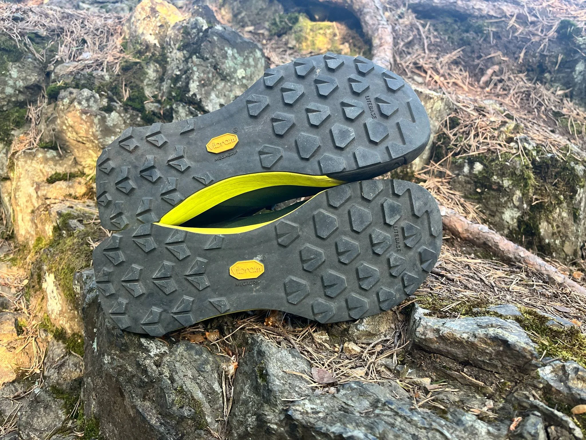 Vertex Speed har en større flat “knast” foran under tærne som gir godt feste på stein. Knastene ellers gir godt grep også for løsere underlag både opp og ned.